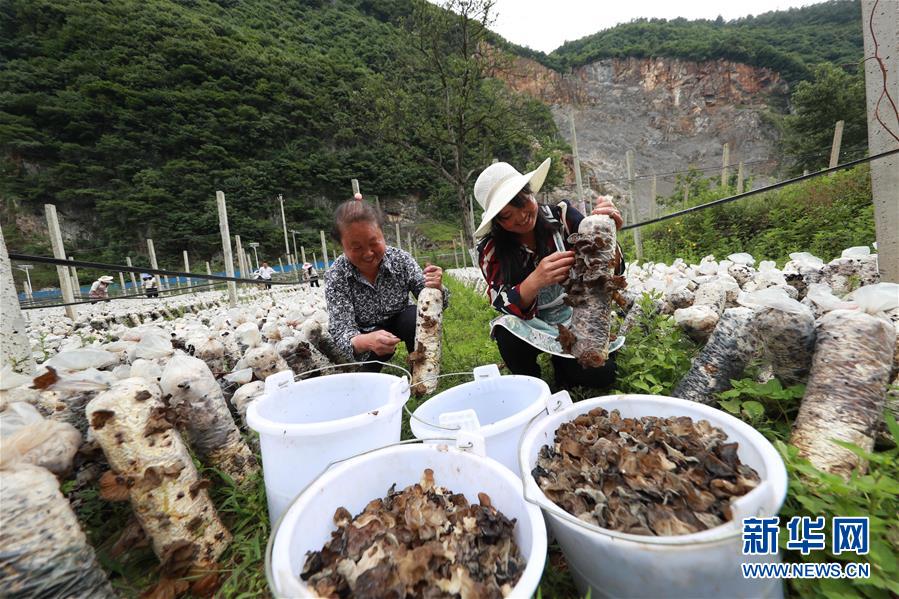 6月21日,村民在贵州省毕节市赫章县双坪乡新田村黑木耳种植基地采摘木耳。 新华社发(韩贤普 摄)