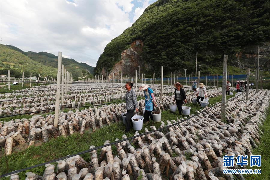 6月21日,在贵州省毕节市赫章县双坪乡新田村黑木耳种植基地,村民在搬运采摘的木耳。 新华社发(韩贤普 摄)