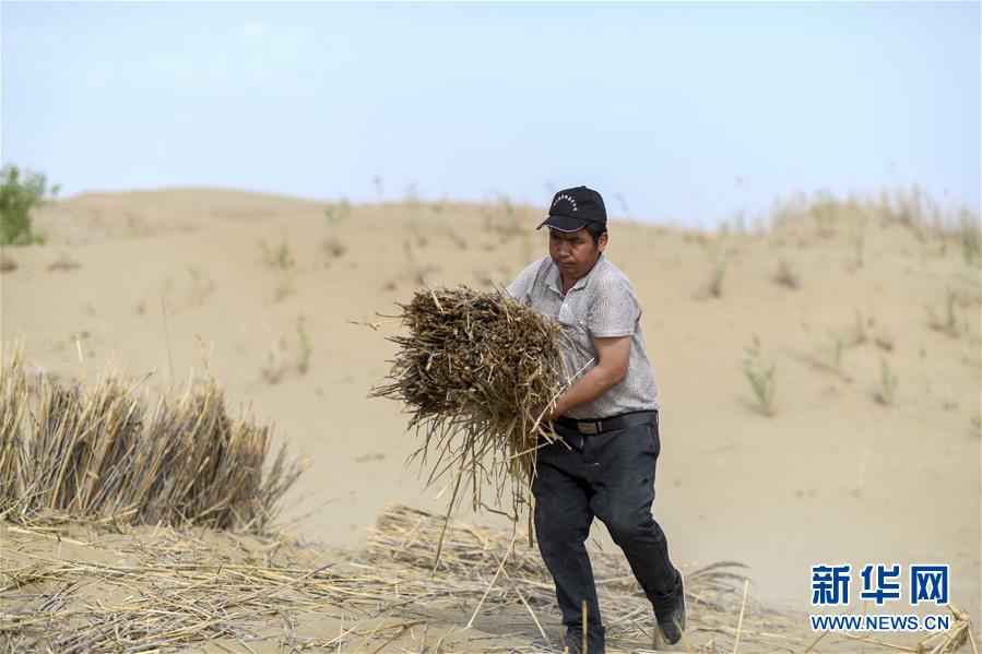 在尉犁县阿其克沙化土地封禁保护区试点项目里,尉犁县国有林管理局的工作人员吾斯曼江·吐尔地在搬运扎草方格用的芦苇(6月20日摄)。 新华社记者 赵戈 摄