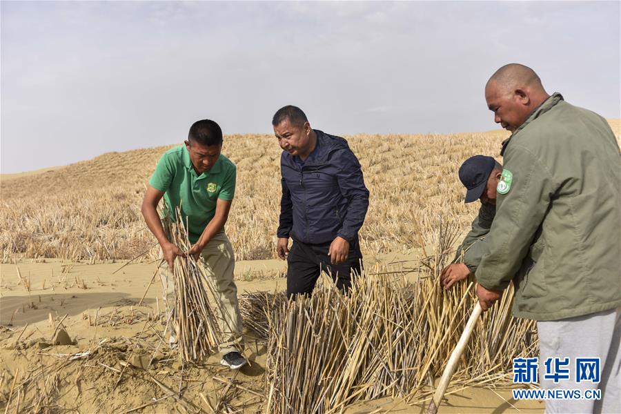 在尉犁县阿其克沙化土地封禁保护区试点项目里,尉犁县国有林管理局的工作人员在沙漠边缘扎草方格(6月20日摄)。 新华社记者 赵戈 摄