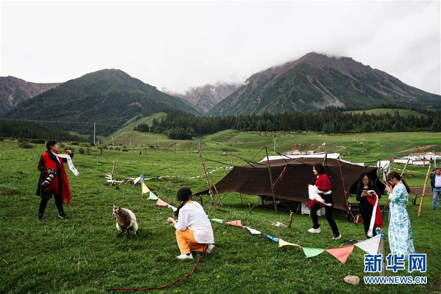 6月21日,游客在祁连县附近一处草场游玩。 新华社记者 吴刚 摄