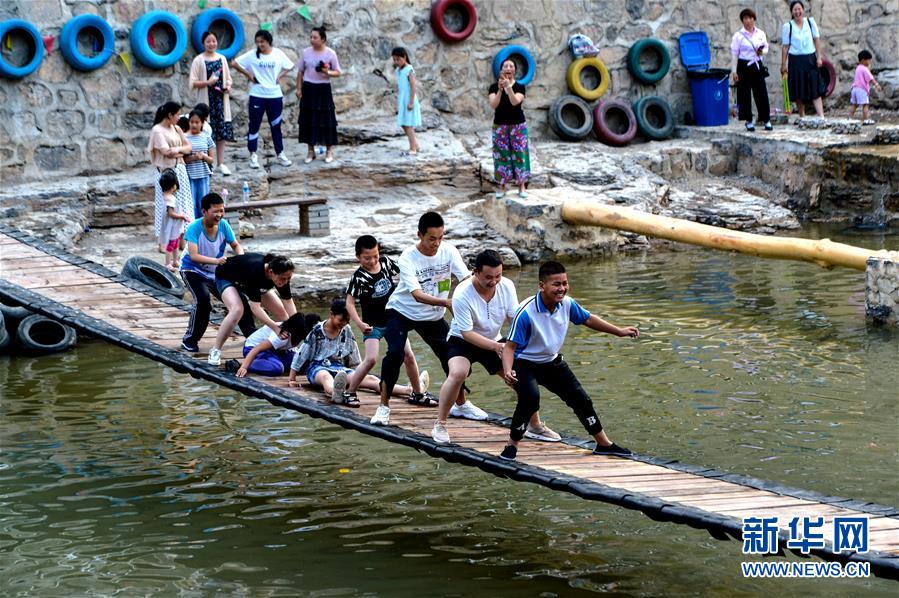 6月22日,游客在河北省涉县井店镇刘家村的吊桥上游玩。 新华社记者 王晓 摄