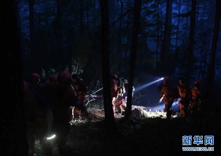6月22日晚,森林消防员领取物资后上山。 新华社记者刘磊摄