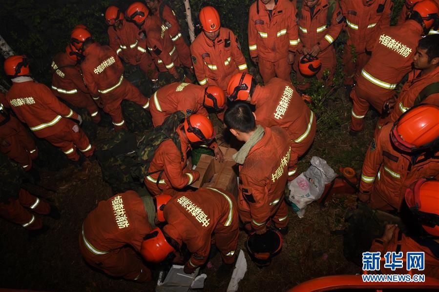 6月22日晚,仍坚守在秀山火场的森林消防员在山谷处领取物资。 新华社记者刘磊摄