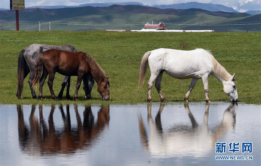 6月22日,在玛曲县河曲马场,几匹河曲马在草原湿地旁觅食休憩。 甘肃省甘南藏族自治州玛曲县是一个藏族聚居的纯牧业县,也是中国名马河曲马的中心产地。河曲马以体格高大、适应性强、能爬高山、善走水草地而闻名,与内蒙古三河马、新疆伊犁马并称为中国三大名马。 新华社记者 马宁 摄