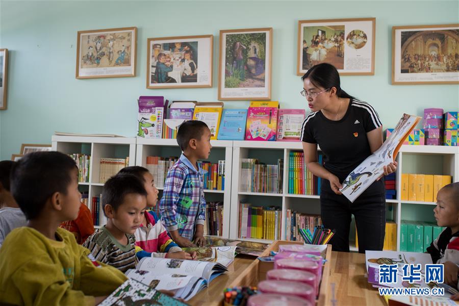 在云南省临沧市双江拉祜族佤族布朗族傣族自治县忙糯乡邦界村,毕起美在邦界完小的幼儿园图书室中给孩子们讲关于恐龙的知识(5月14日摄)。 新华社记者 胡超 摄
