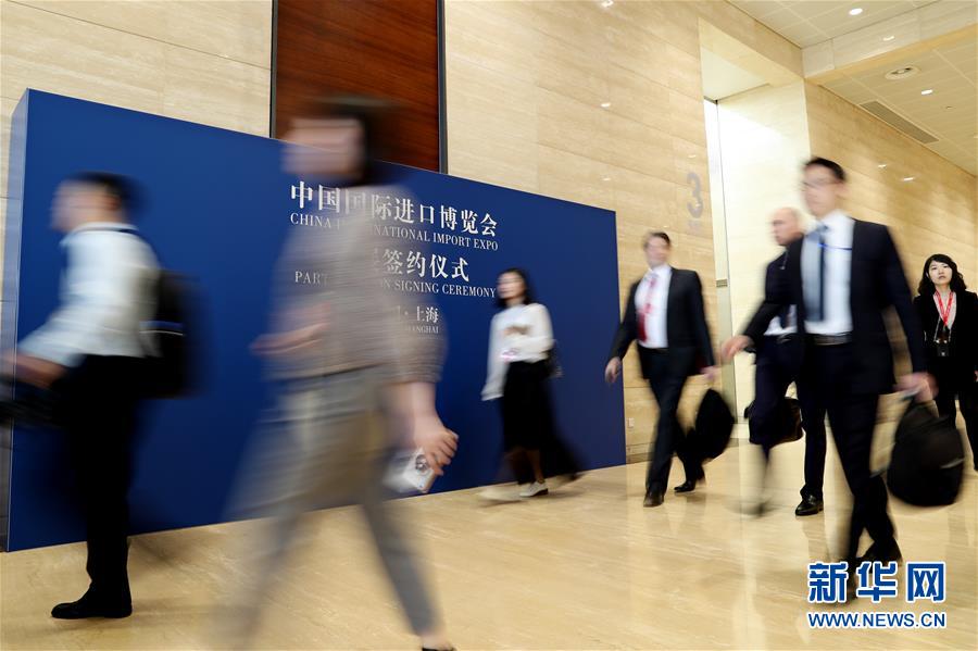 2018年4月2日,中国国际进口博览局在上海国家会展中心举行参展集体签约仪式。这是出席签约仪式的嘉宾陆续步入会场。新华社记者 方喆 摄