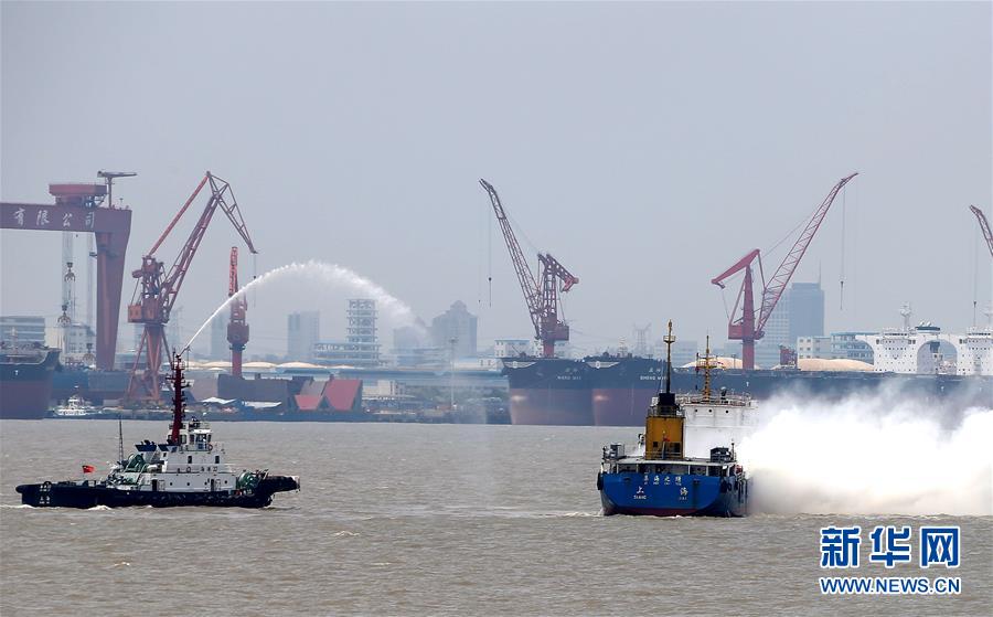 6月24日,救助船只对“起火的集装箱船”实施喷水灭火。 新华社记者 陈飞 摄