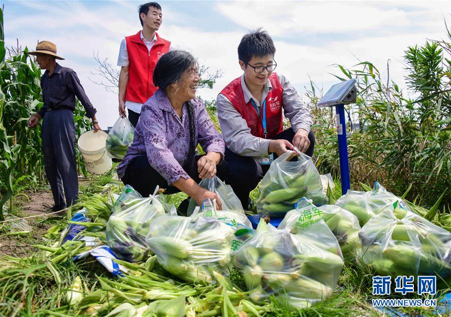 6月24日,青年党员志愿者帮助低保户老人把收获的玉米过秤称重。 新华社记者 徐昱 摄