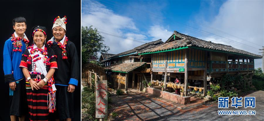 这是一张拼版照片。左图:德宏傣族景颇族自治州芒市三台山德昂族乡出冬瓜村三组德昂族村民李腊六(右)一家合影(6月19日新华社记者胡超摄);右图:李腊六家的房子入选了古村落保护项目,于2017年进行翻修,保持了原始的建筑风貌,现在经营特色民宿,去年收入约6万元(6月19日新华社记者秦晴摄)。 新华社发