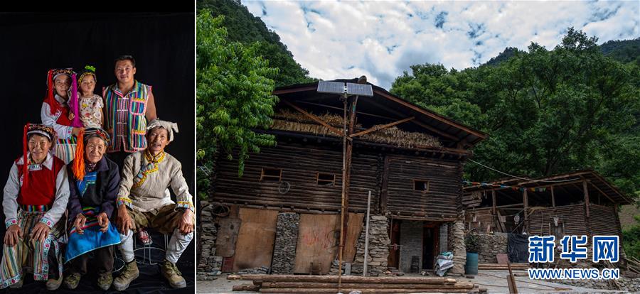 这是一张拼版照片。左图:怒江傈僳族自治州贡山县丙中洛镇秋那桶村雾里一组怒族村民王里各(后排右)一家合影;右图:王里各家正在修建的房屋和客栈。他家有12亩地,年收入约4万元(6月23日摄)。 新华社记者 江文耀 摄