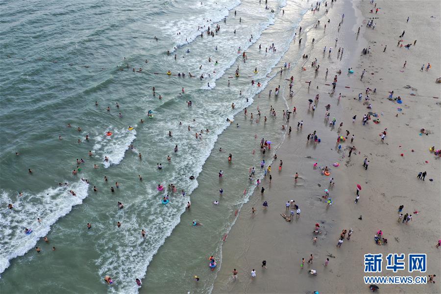 6月25日,游客在广西北海市银滩游玩(无人机拍摄)。 近日,广西北海市银滩进入旅游旺季。 新华社记者 陆波岸 摄