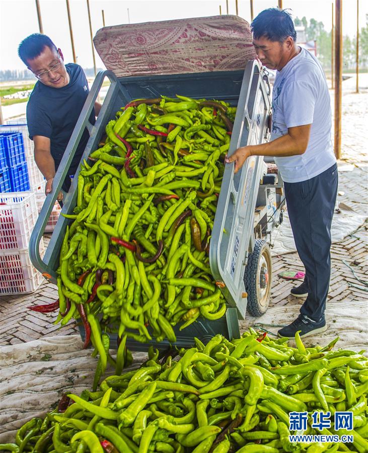 6月25日,河北省枣强县恩察镇郭堂村村民在搬运尖椒。 近年来,河北省枣强县对照京津市场准入条件,不断引进优良品种,推进农业合作社和农业种植公司与京津多家大型超市对接,引导农民发展绿色有机农产品种植。目前,该县发展设施蔬菜温室大棚5万余亩,日供京津市场绿色无公害蔬菜超过100吨。 新华社记者 李晓果摄