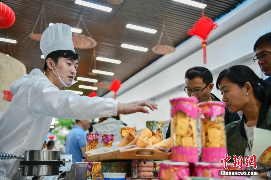 乌鲁木齐市馕文化产业园是乌市重点打造的以馕文化为基础,集工业、文化、旅游、休闲娱乐等为一体的大型综合性旅游项目。园区围绕产业招商引资,以馕为突破口,不断延伸产业链,并结合支柱产业,突出体验性、创意性,有效地推动了相关消费、休闲及旅游的发展。图为6月11日,园区工作人员向顾客推销当地农产品制成的食品。中新社记者 张兴龙 摄