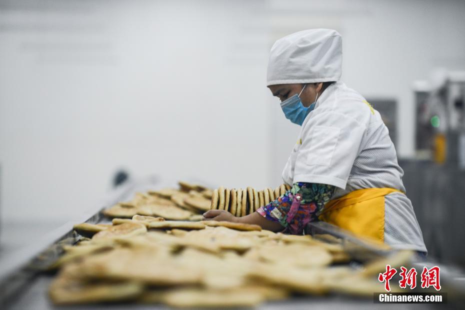 乌鲁木齐市馕文化产业园是乌市重点打造的以馕文化为基础,集工业、文化、旅游、休闲娱乐等为一体的大型综合性旅游项目。园区围绕产业招商引资,以馕为突破口,不断延伸产业链,并结合支柱产业,突出体验性、创意性,有效地推动了相关消费、休闲及旅游的发展。图为6月11日,园区工人人员整理制作完成的馕。中新社记者 张兴龙 摄
