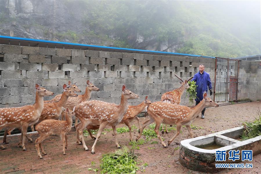 6月25日,在纳雍县勺窝乡务井村梅花鹿养殖基地,姜远平在查看梅花鹿生长情况。 纳雍县是贵州省毕节市的一个深度贫困县,姜远平是纳雍县居仁街道路尾坝社区村民,1992年到广东务工。2010年,姜远平看到沿海地区鹿茸等梅花鹿产品市场紧俏,决定到东北学习梅花鹿养殖技术。 2012年,姜远平学成后贷款买了76头梅花鹿回到家乡,开始利用当地丰富的荒山草坡资源从事梅花鹿养殖。几年下来,他不但还清了借款,还不断扩大养殖规模,开发出了鹿茸精、鹿胎膏、鹿角粉等10多种产品供应市场。 在养鹿的过程中,姜远平带动家乡群众一起脱贫致富。养殖基地需要工人,他尽量聘请贫困户;大家不懂梅花鹿养殖技术,他就手把手地教;梅花鹿养殖需要大量草料,他就动员大家种植和到山上收割牧草,全部保底收购。他还建起鹿产品加工厂,解决了100多名贫困群众的就业问题。 姜远平说,他最大的心愿就是利用自己掌握的技术,不断壮大梅花鹿养殖产业,开发出更多的产品,和家乡群众一起脱贫致富奔小康。 新华社发(韩贤普 摄)