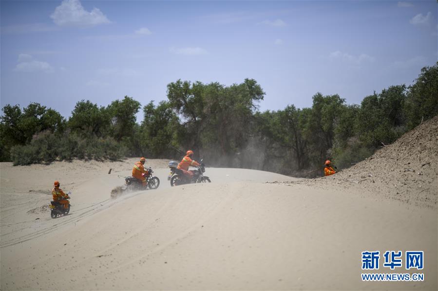 在尉犁县罗布淖尔国家湿地公园内,扑火队队员骑着摩托车穿行在沙漠胡杨中(6月19日摄)。 新华社记者 赵戈 摄