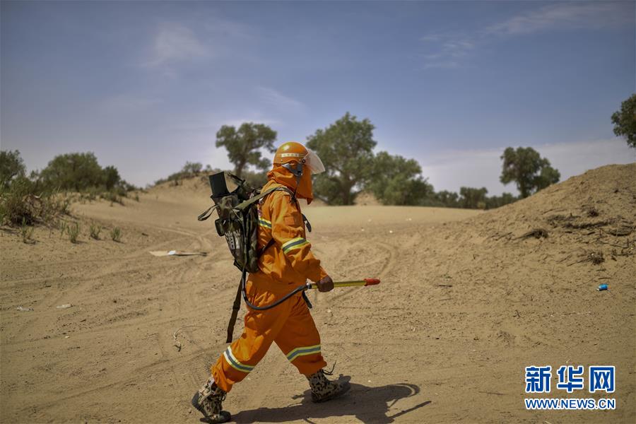 在尉犁县罗布淖尔国家湿地公园内,扑火队队员装满灭火水枪准备进行扑火演练(6月19日摄)。 新华社记者 赵戈 摄