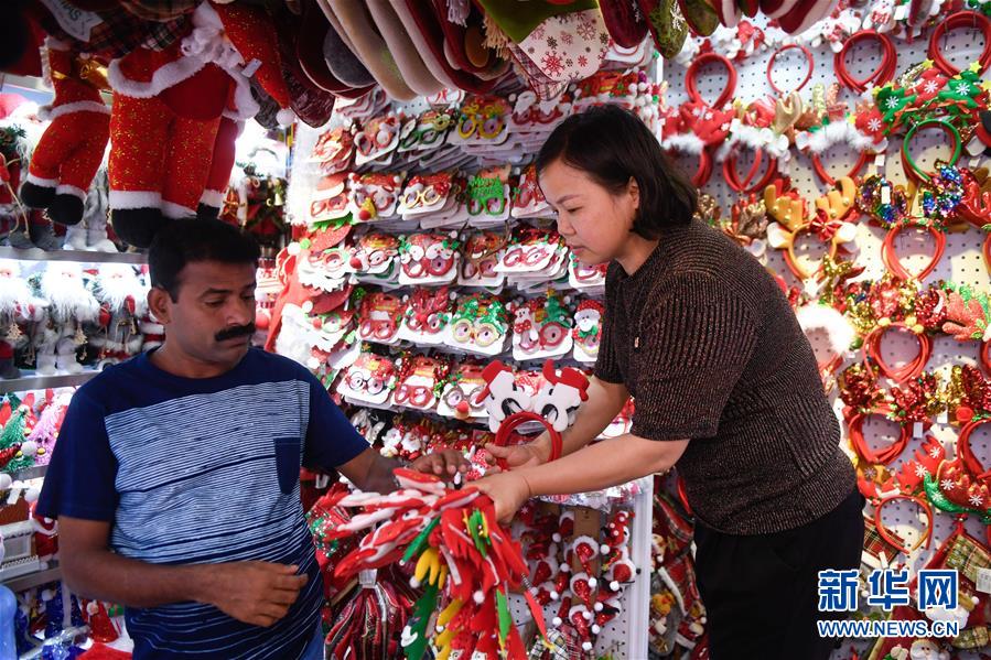 6月26日,义乌国际商贸城内一家圣诞用品商店的经营者朱爱娟(右)向外国客商展示样品。 近期以来,浙江省义乌市小商品市场迎来圣诞订单旺季。拥有400多家圣诞用品生产企业的义乌市已成为全球最大的圣诞用品集散地,涉及圣诞玩具、圣诞树、圣诞服饰等上万个品种的商品,约占全球60%的市场份额。 义乌市商务局提供的数据显示,2018年义乌市圣诞用品出口22.65亿元,同比增长18.12%。 新华社记者 黄宗治 摄