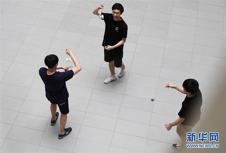 赵宸与朋友们一起在北京三里屯附近的一家商场内练球(6月23日摄)。 新华社记者 张晨霖 摄