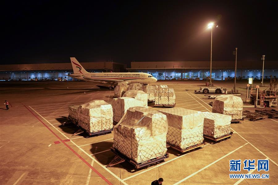 6月26日凌晨,重庆机场货机坪上,整齐码放着准备装载到全货机上的各色货物。 新华社记者 刘潺 摄