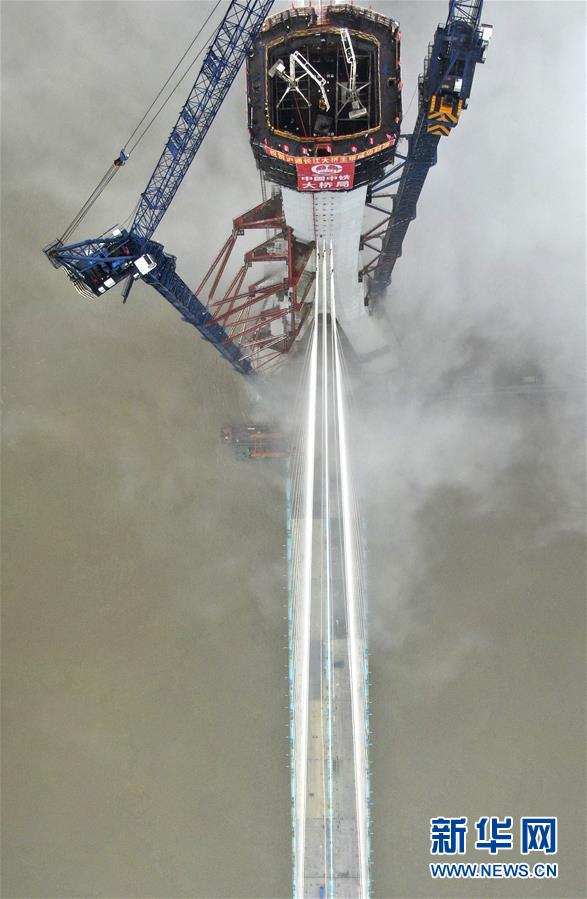 6月26日拍摄的沪通长江大桥南主塔封顶施工现场(无人机拍摄)。新华社发(许丛军摄)