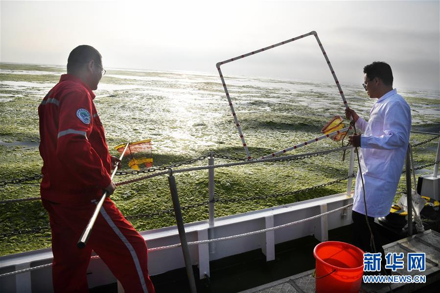 6月27日,自然资源部北海局海洋监测人员在打捞浒苔,进行取样检测。 新华社记者 李紫恒 摄