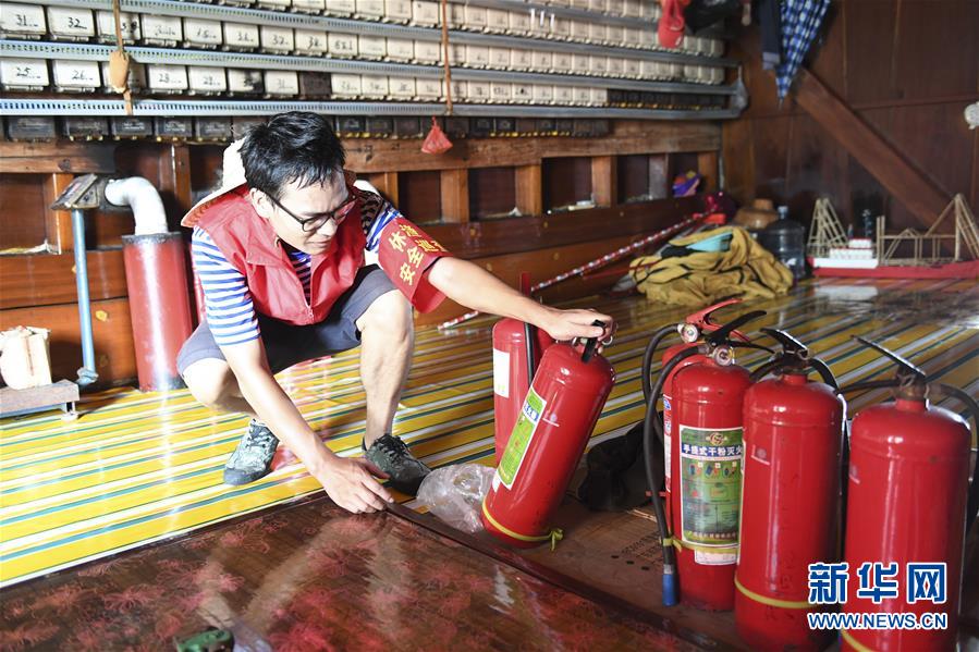 6月27日,侨港镇党员干部服务队队员姚辉林在对渔船上的消防器材进行检查。 当日,广西北海侨港镇党员干部服务队队员们登上渔船,对伏季休渔期回港的渔船进行消防安全检查,同时为渔民宣讲政策,现场解答渔民们的疑问。 近年来,北海市侨港镇建立“海上党旗红”党建机制,打造“一站式”便民服务平台,把党支部建在渔船上,组建多支党员服务队,零距离服务渔民。 新华社记者 曹祎铭 摄