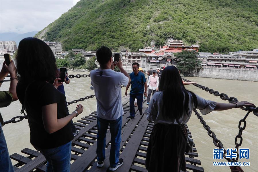 游客在泸定桥上行走(6月27日摄)。泸定桥位于四川省甘孜藏族自治州泸定县泸桥镇,是一座跨大渡河铁索桥,因红军“飞夺泸定桥”战斗而闻名。