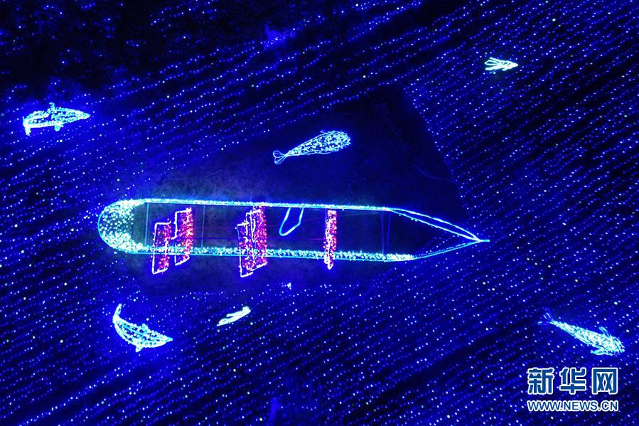 河北省沙河市红石沟现代农业园区“梦幻灯光节”的一处景观(6月28日无人机拍摄)。 6月下旬以来,河北省沙河市红石沟现代农业园区举办“梦幻灯光节”,光影闪烁交织出梦幻的风景,吸引各地游客前来观赏游玩。 新华社记者 牟宇 摄