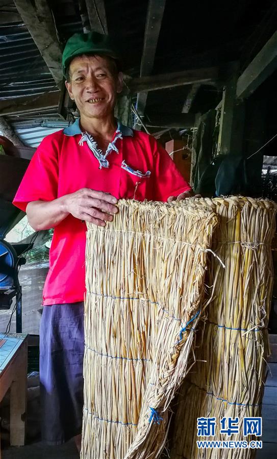 在云南省泸水市称杆乡双奎地村,傈僳族村民亚普扒展示过去在火塘边睡觉用的草垫(6月25日摄)。新华社记者 伍晓阳 摄