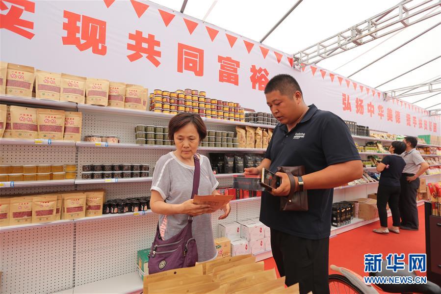 6月28日,市民在市集上了解扶贫产品。 当日,“爱心扶贫·你我同行”消费扶贫市集在天津和平区金街正式开业,来自甘肃、河北、新疆、西藏等地的数百种农产品亮相市集。据悉,扶贫市集还将在线上线下组织特色展卖活动,拓宽贫困地区农产品的销售渠道,助力脱贫攻坚。 新华社发(沈岳摄)