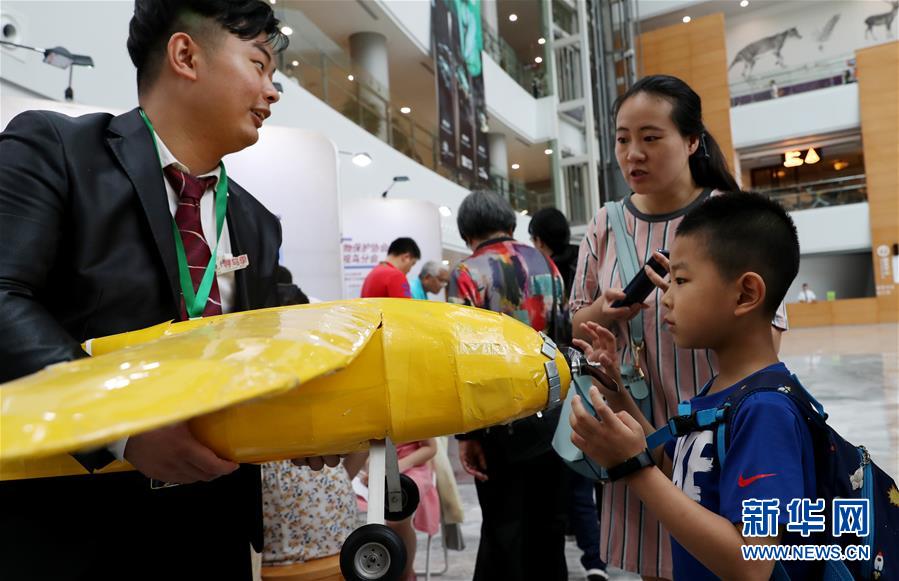 6月29日,同济大学航空航天与力学学院的在读博士余翼(左)向观众介绍一个根据4000多年前古埃及“木鸟”飞行器设计的验证复飞模型。 当日,“寻鸟高手——科学家面对面”活动在上海自然博物馆开幕。来自浙江、河南、湖北以及上海的鸟类科学家们在博物馆内,通过标本、模型、图书、视频、实验设备等与观众互动,展示鸟类科研及调查的最新成果。 新华社记者 方喆 摄