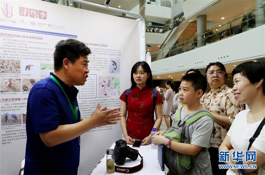 6月29日,郑州自然博物馆馆长李长看(左)在展位前向观众介绍崖沙燕的观察和保护工作。 当日,“寻鸟高手——科学家面对面”活动在上海自然博物馆开幕。来自浙江、河南、湖北以及上海的鸟类科学家们在博物馆内,通过标本、模型、图书、视频、实验设备等与观众互动,展示鸟类科研及调查的最新成果。 新华社记者 方喆 摄