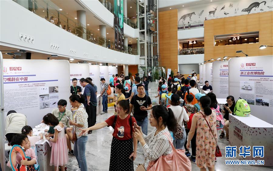 6月29日,观众在活动现场参观。 当日,“寻鸟高手——科学家面对面”活动在上海自然博物馆开幕。来自浙江、河南、湖北以及上海的鸟类科学家们在博物馆内,通过标本、模型、图书、视频、实验设备等与观众互动,展示鸟类科研及调查的最新成果。 新华社记者 方喆 摄