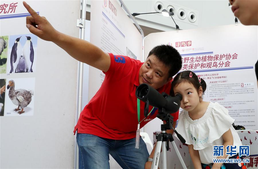 6月29日,一名小观众在现场体验用于鸟类观测的高倍率望远镜。 当日,“寻鸟高手——科学家面对面”活动在上海自然博物馆开幕。来自浙江、河南、湖北以及上海的鸟类科学家们在博物馆内,通过标本、模型、图书、视频、实验设备等与观众互动,展示鸟类科研及调查的最新成果。 新华社记者 方喆 摄