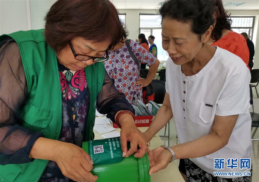 6月29日,志愿者为每家居民的厨余垃圾桶贴上户名标签。当日,北京市丰台区东高地街道各社区的3000多户居民领取了用于盛放厨余垃圾的小桶。居民将厨余垃圾装入小桶放置到统一的回收架上,物业部门统一处理后再领回自己家的小桶,以“小桶带大桶”的形式来引导社区居民参与垃圾分类。新华社记者 李欣 摄