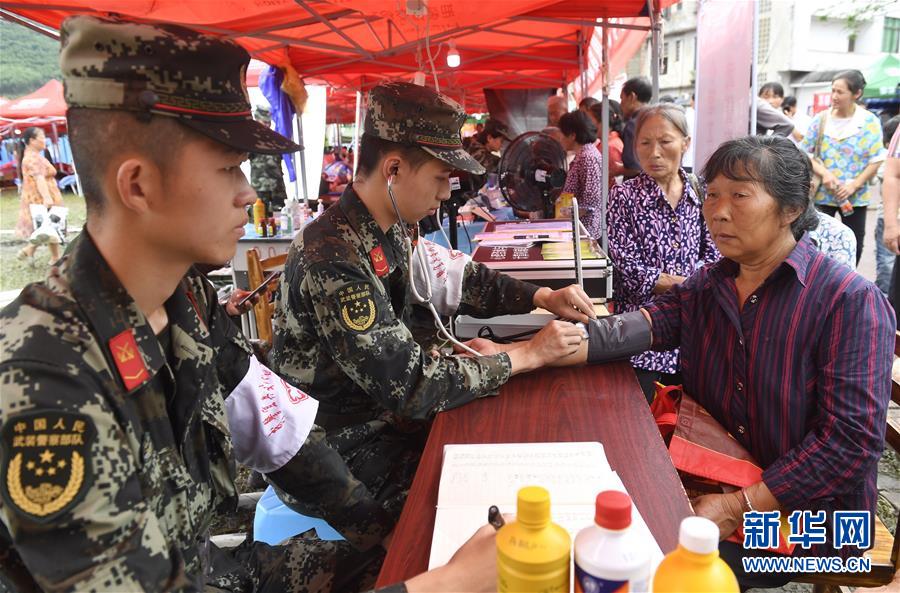 在四川长宁地震灾区安置点,武警宜宾支队卫生队党小组成员为群众提供医疗服务(6月20日摄)。新华社记者 刘坤 摄