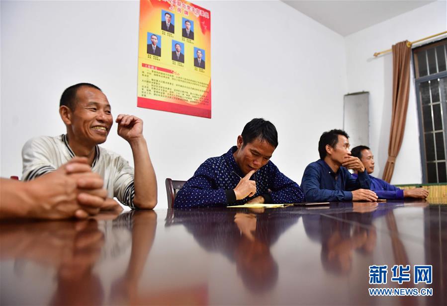 在乌英苗寨联合党支部办公室,广西籍党员梁秀平(左二)和村民在开会商量苗寨事务(6月18日摄)。 乌英苗寨位于黔桂交界的大苗山深处,共有140户600多人。其中100户属广西柳州市融水苗族自治县杆洞乡党鸠村,40户属贵州省从江县翠里瑶族壮族乡南岑村。由于地处偏远,山多地少,脱贫攻坚任务艰巨,目前整个苗寨还有59户贫困户。 面对经济发展落后、贫困面广且程度深的现状,为加强基层党组织的领导核心作用,2017年6月,广西融水苗族自治县杆洞乡党委和贵州省从江县翠里瑶族壮族乡党委针对乌英“一寨跨两省区”的特点,积极探索党建新模式,组建成立“中国共产党桂黔两省(区)乌英屯联合支部委员会”。目前,联合党支部共有党员13名,其中广西籍9名,贵州籍4名。 乌英苗寨联合党支部的建立,使基层党组织的作用突破了行政区域的局限。改善基础设施和环境卫生、成立水果种植合作社、探索发展旅游产业、调解邻里纠纷、组织文体活动……两年来,联合党支部在乌英苗寨的各项工作中积极发挥引领作用,带领群众稳步走在脱贫致富的道路上。 新华社记者 黄孝邦 摄