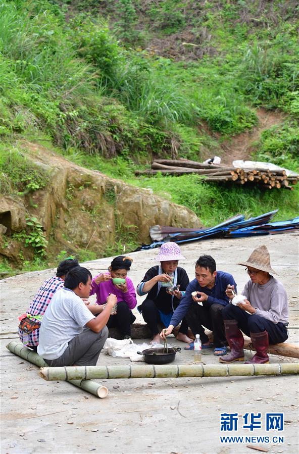 在乌英苗寨,广西籍党员梁安合(右一)和村民在红薯种植基地旁吃午饭(5月25日摄)。 乌英苗寨位于黔桂交界的大苗山深处,共有140户600多人。其中100户属广西柳州市融水苗族自治县杆洞乡党鸠村,40户属贵州省从江县翠里瑶族壮族乡南岑村。由于地处偏远,山多地少,脱贫攻坚任务艰巨,目前整个苗寨还有59户贫困户。 面对经济发展落后、贫困面广且程度深的现状,为加强基层党组织的领导核心作用,2017年6月,广西融水苗族自治县杆洞乡党委和贵州省从江县翠里瑶族壮族乡党委针对乌英“一寨跨两省区”的特点,积极探索党建新模式,组建成立“中国共产党桂黔两省(区)乌英屯联合支部委员会”。目前,联合党支部共有党员13名,其中广西籍9名,贵州籍4名。 乌英苗寨联合党支部的建立,使基层党组织的作用突破了行政区域的局限。改善基础设施和环境卫生、成立水果种植合作社、探索发展旅游产业、调解邻里纠纷、组织文体活动……两年来,联合党支部在乌英苗寨的各项工作中积极发挥引领作用,带领群众稳步走在脱贫致富的道路上。 新华社记者 黄孝邦 摄