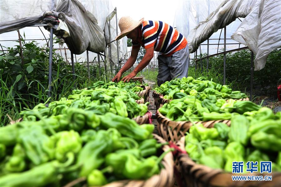 6月29日,在重庆市黔江区舟白街道县坝社区蔬菜基地,村民在分拣辣椒。 夏日炎炎,各地农民抢抓农时忙碌在田间地头。 新华社发(杨敏 摄)