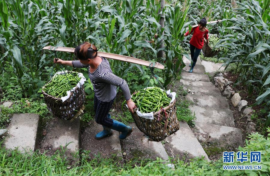 6月29日,在重庆市黔江区舟白街道县坝社区蔬菜基地,村民在挑运辣椒。 夏日炎炎,各地农民抢抓农时忙碌在田间地头。 新华社发(杨敏 摄)