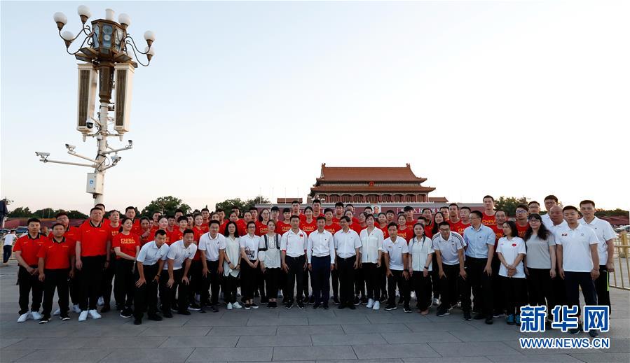 7月1日 ,中国篮协工作人员、国家女篮、国奥男篮队成员等在观看升国旗仪式后合影。