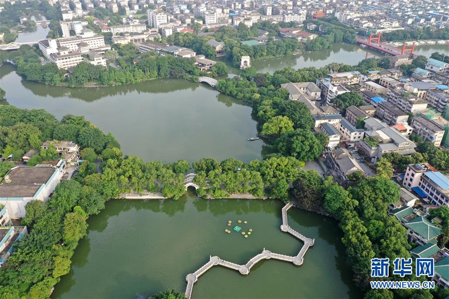 桂林市榕湖附近景观(7月1日无人机拍摄)。 夏日时节,广西桂林市区内的榕湖、杉湖、桂湖、木龙湖等地绿树成荫、景色迷人。 新华社记者陆波岸摄