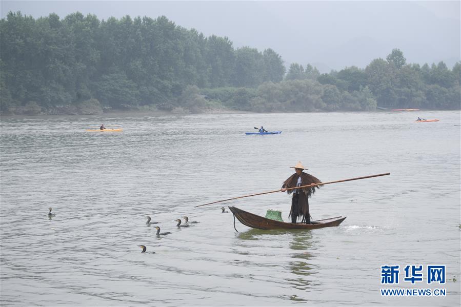 7月1日,在东梓关村边的富春江面上,渔民在表演鱼鹰捕鱼。