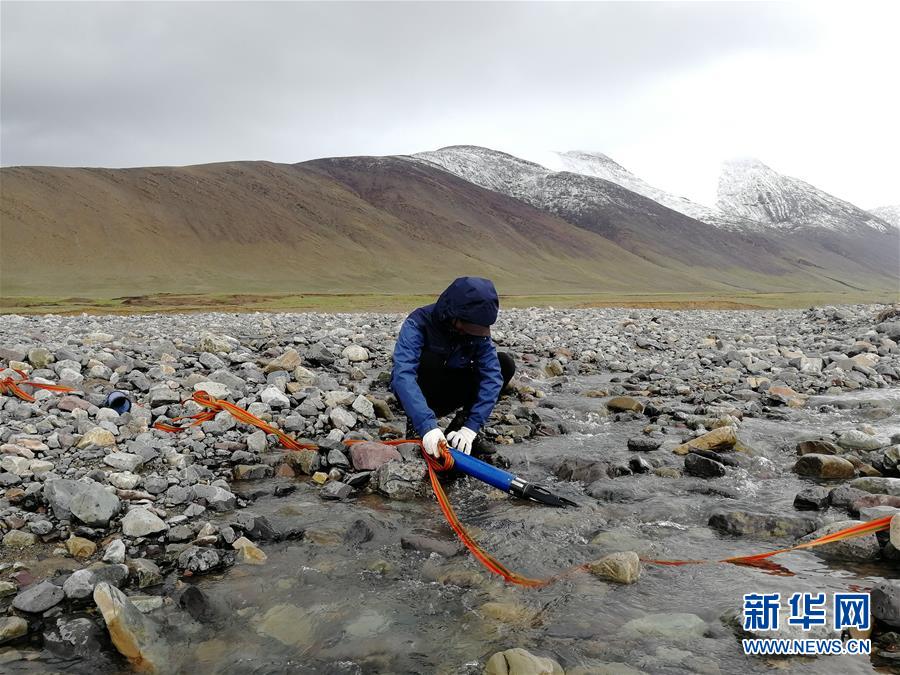7月1日14时03分,在西藏海拔5170米的一处冰川,参加第二次青藏科考的队员在监测冰川径流水质(手机拍摄)。 新华社发(汪文强 摄)
