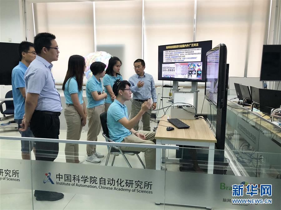 7月1日10时20分,在中科院自动化所脑网络组研究中心,指导老师在与参加“中科院·香港青年实习计划”的同学们交流科研问题(手机拍摄)。 新华社发(鲁宁 摄)