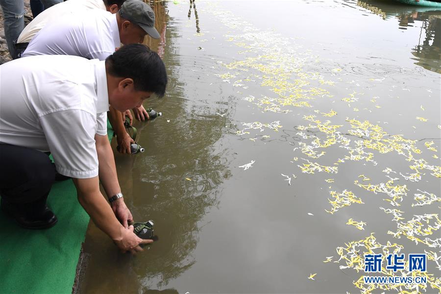 7月1日,福建籍红军后人在广西兴安县界首镇湘江江边盛装湘江水准备带回福建老家。 当日,再走长征路的记者团、红军后人的代表以及当地党员干部一行在湘江岸边的广西兴安县祭奠红军烈士。1934年底的湘江战役,是红军长征出发以来最壮烈的一仗,也是关系红军生死存亡的关键一仗。 新华社记者 周华 摄