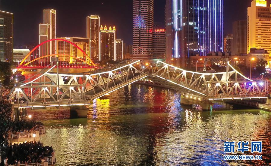 天津解放桥在7月1日晚开启(无人机拍摄)。 7月1日,位于海河之上的天津解放桥在夜色中缓缓开启桥面,周边灯火璀璨引万人围观。今后,为提升城市夜间景观效果,满足广大市民与游客的观光需求,解放桥逢重大节假日在条件允许的情况下都将进行开启。 作为天津标志性建筑物的解放桥是一座全钢结构可开启的桥梁,桥长90余米,桥面总宽近20米。解放桥原名万国桥,最初建于1902年,于1923年重建,1927年正式建成。1949年,更名为解放桥。 新华社记者李然摄