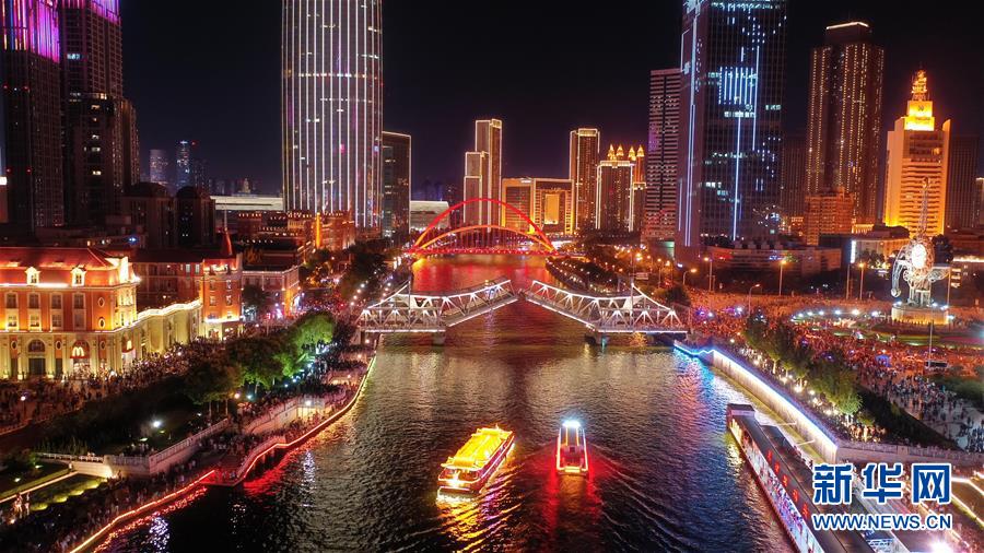 天津解放桥在7月1日晚开启(无人机拍摄)。 7月1日,位于海河之上的天津解放桥在夜色中缓缓开启桥面,周边灯火璀璨引万人围观。今后,为提升城市夜间景观效果,满足广大市民与游客的观光需求,解放桥逢重大节假日在条件允许的情况下都将进行开启。 作为天津标志性建筑物的解放桥是一座全钢结构可开启的桥梁,桥长90余米,桥面总宽近20米。解放桥原名万国桥,最初建于1902年,于1923年重建,1927年正式建成。1949年,更名为解放桥。 新华社记者李然摄